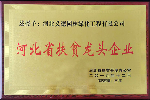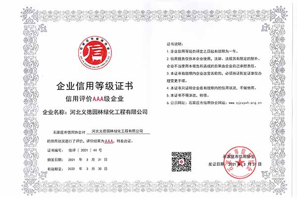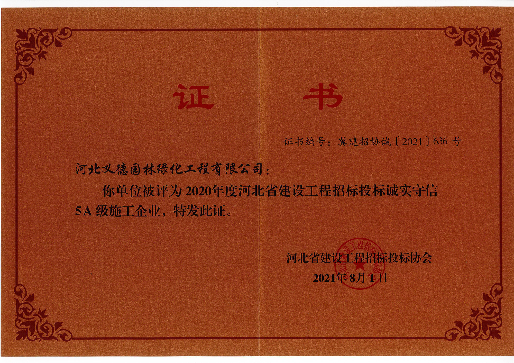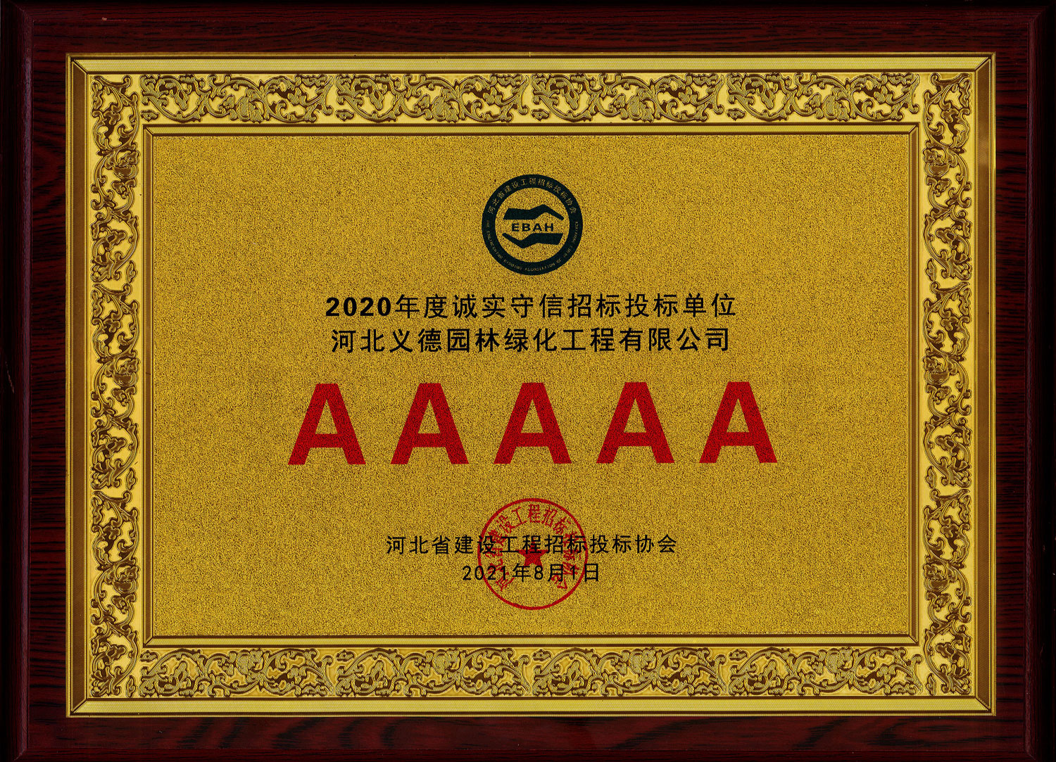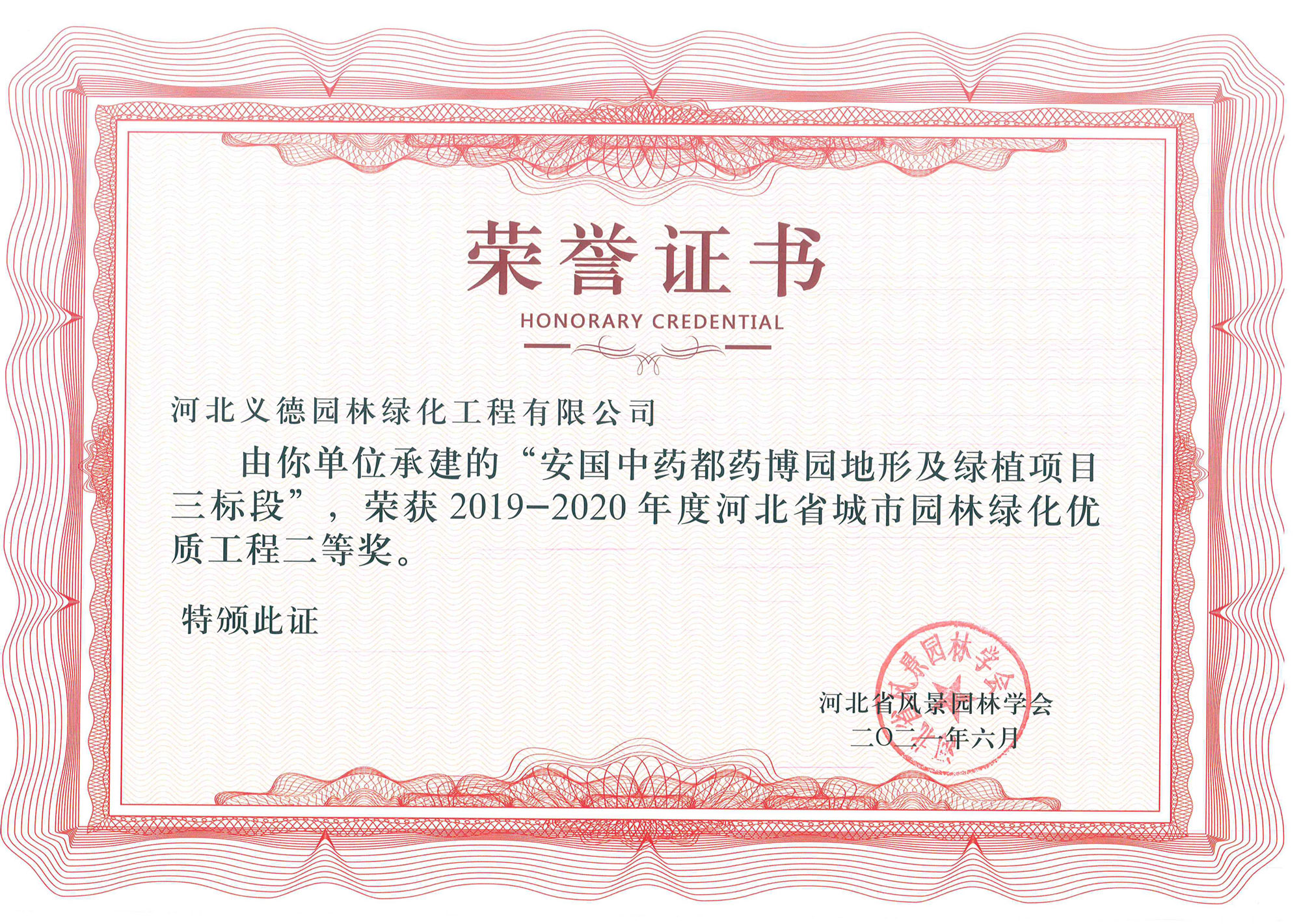 近幾年來(lái)我公司被授予2019年-2022年河北省扶貧龍頭企業(yè)、2018年國(guó)家林業(yè)標(biāo)準(zhǔn)化示范企業(yè)、2019年度全國(guó)苗圃50強(qiáng)、2018-2019年度河北省林業(yè)重點(diǎn)龍頭企業(yè)、2018年保定市精品特色現(xiàn)代農(nóng)業(yè)園區(qū)、2018年度保定林木種苗協(xié)會(huì)授予特色苗圃、2018年度北方十佳特色苗圃、2016-2019年河北省建設(shè)工程招標(biāo)投標(biāo)誠(chéng)實(shí)守信5A級(jí)施工企業(yè)等榮譽(yù)稱(chēng)號(hào),2017年保定市林木種苗龍頭企業(yè)、石家莊市2017年度優(yōu)秀園林企業(yè)。